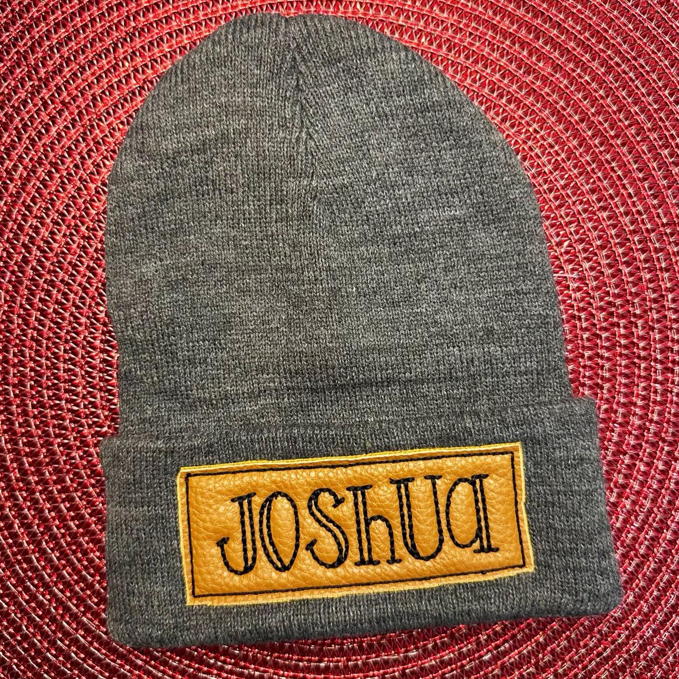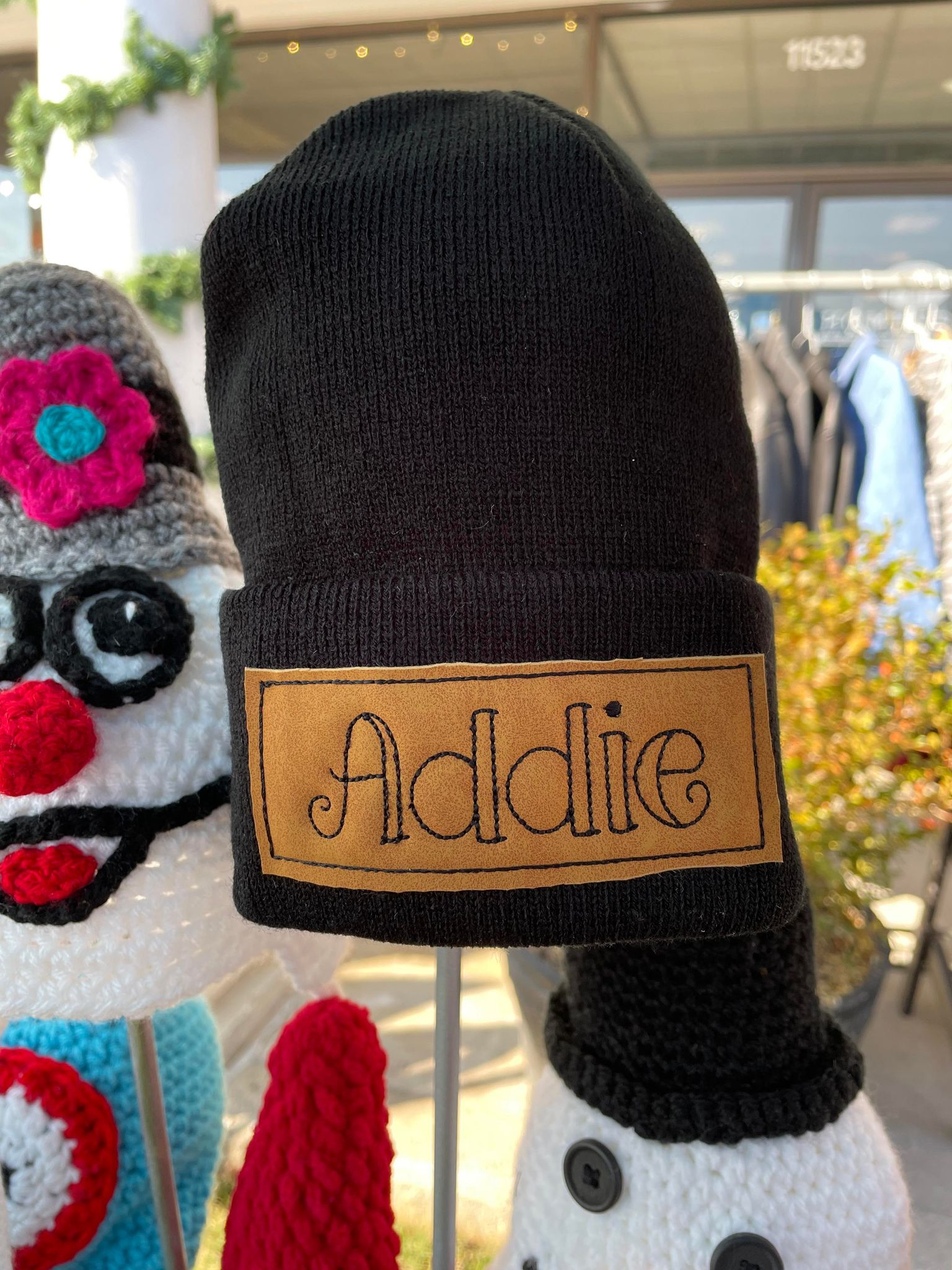 Knit Beanie with a custom faux leather patch and custom embroidered name. Several hat colors available as well as patch colors. Thread options are white or black. The outline of the patch will be the same color thread as the name.